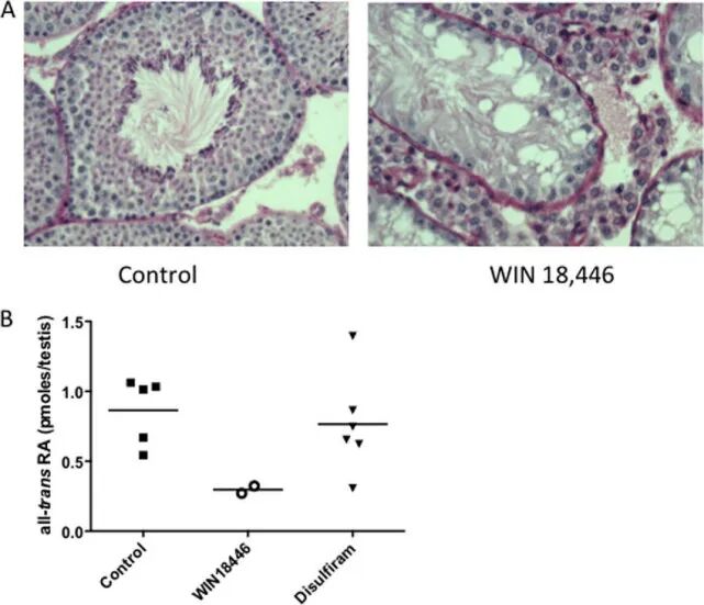 对于男性而言,精子细胞的形成需要视黄酸的参与,而WIN-18446恰好是锁定了ALDH酶,让身体无法产生视黄酸,自然也就无法产生成熟的精子。