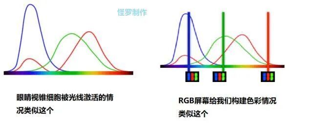 也正因为如此,我们的电脑屏幕(RGB屏幕)可以仅通过三种颜色(红绿蓝波长的光)来构建我们生活中的几乎所有色彩,而不需要真的对应光的相应波长,因为三种颜色对视锥细胞的激活情况可以给大脑一个相似的想象过程。