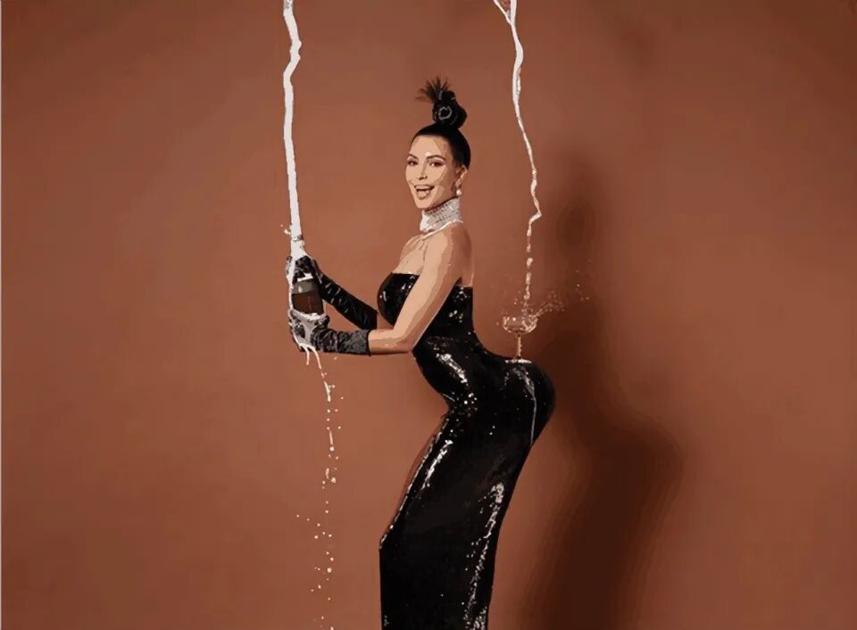 画面中,将一个酒杯平稳放在屁股上,卡戴珊从正面开启香槟,香槟绕过身体,优雅地进入酒杯中。