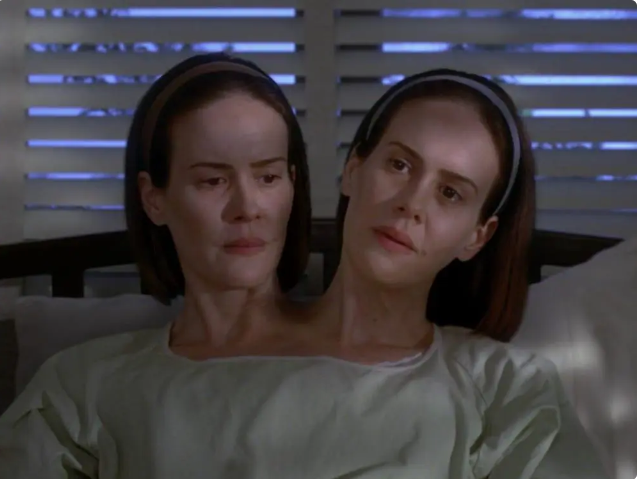 说起双头人,你可能第一时间想到的是连体双胞胎,就是共用身体,身体上一左一右有2个脖子2个头,就像下面这张图片(出自《美国恐怖故事:畸形秀》)。
