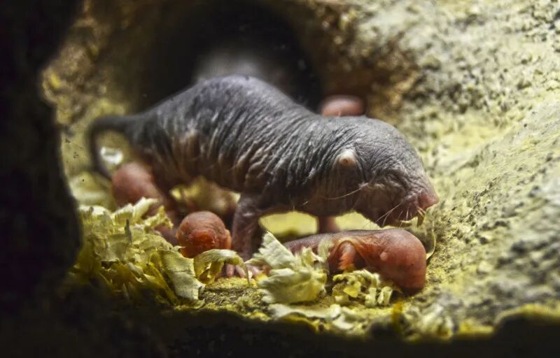 这个其实和裸鼹鼠的社会属性有关系,它们和蚂蚁、蜜蜂差不多,整个群体中只有一个女王拥有生育权利,女王超生的部分其它雌性个体可以帮忙哺乳。