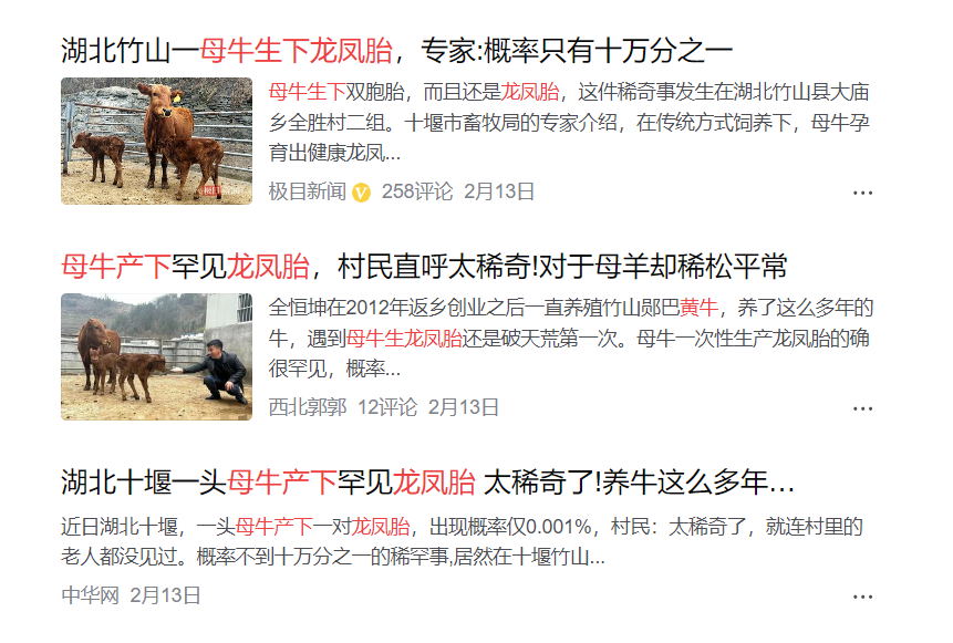图:今年年初湖北的一头牛产下了一对龙凤胎,不过这个概率不是报道的那样只有十万分之一