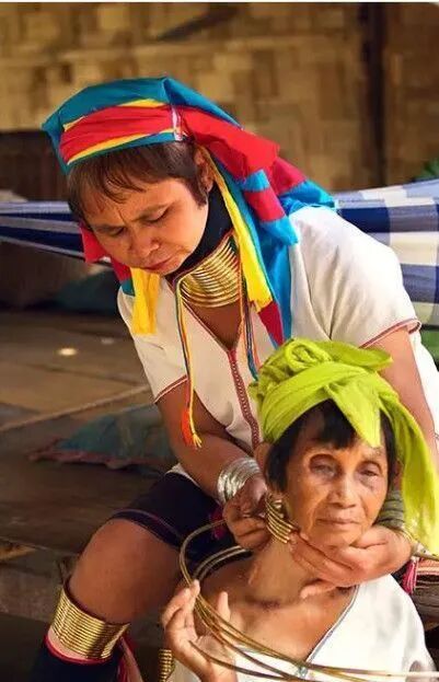 还有更夸张的,认为是男性故意让女性佩戴铜圈,把脖子拉长,看起来丑丑的,那么老婆就不会被别的部落掳走了。