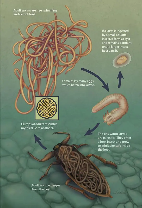 铁线虫的一生需要经历卵、幼虫和成虫三个阶段。成虫雌雄异体,就像开头提到的“线团”那样,它们会在水里相遇并繁殖产生下一代,而这些卵会被一些水生昆虫吃进肚子里,随后这些小昆虫又被螳螂这样的陆生昆虫吃掉,最终这些幼虫留在螳螂体内了。