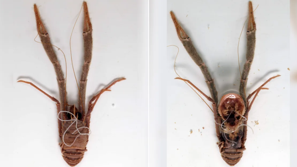这个画面是非常令人不舒服的,别看螳螂小小的,但其体内能钻出十几条又肥又长的铁线虫。为了尽可能利用螳螂有限的空间,铁线虫之间会相互缠绕折叠,据说,一只普通的螳螂,体内完全可以塞下36条铁线虫,铁线虫可谓是空间利用大师。