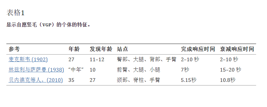 希瑟斯将它称为Voluntarily Generated Piloerection,简称“VGP”,就是能自主控制竖起汗毛的能力。科学家预估,像这样的人大约每1500个人中就有1个。