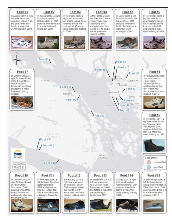 在过去15年里,BC 省已经发现了16只断脚(包括最近发现的这只),为此,警方还给这些断脚画了一张地图。