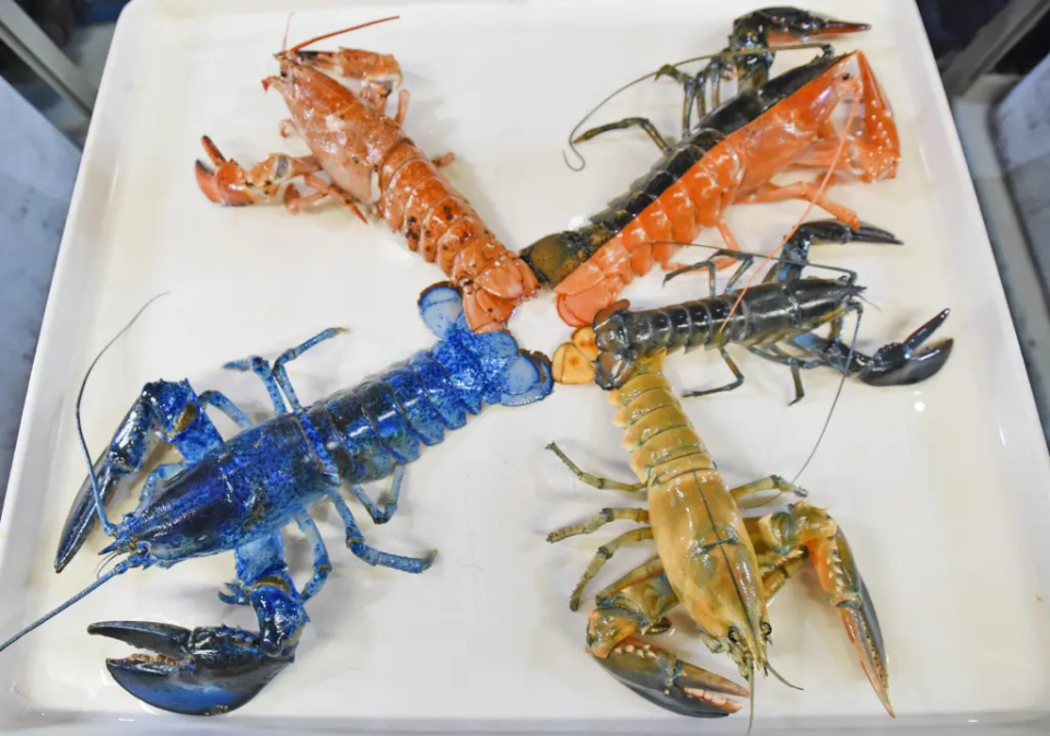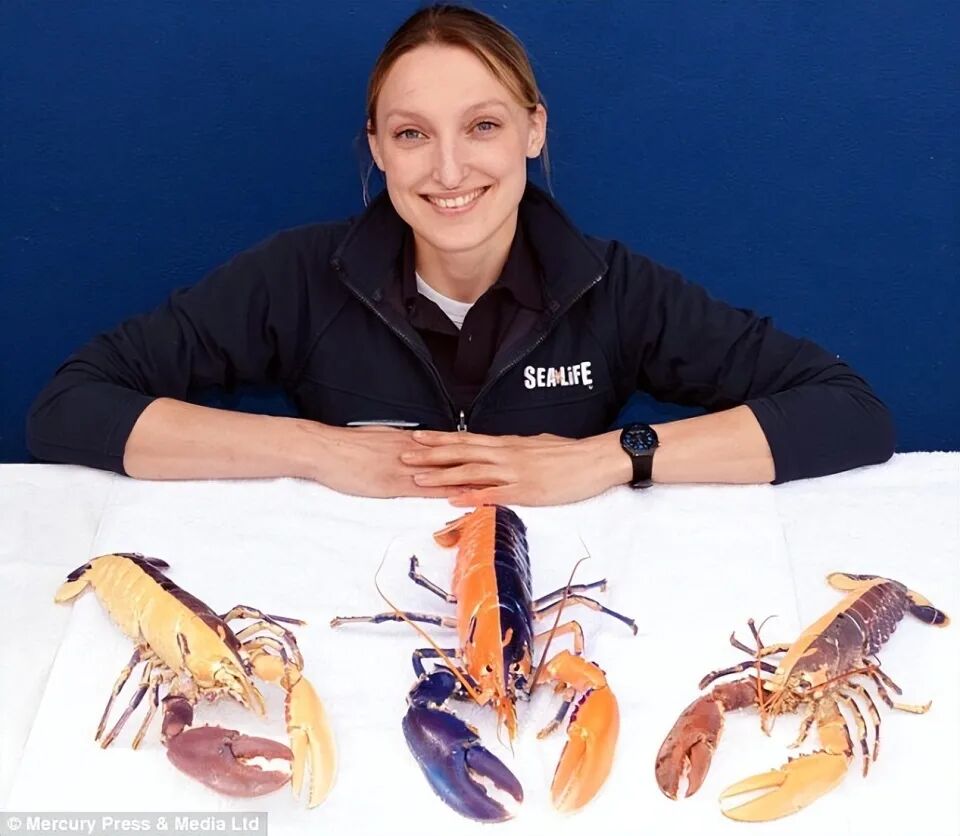 据科学家表示,这些罕见龙虾的发生率各不相同,分别是纯蓝色200万分之一,橙红色(就像是煮熟的颜色)1000万分之一,亮黄色3000万分之一,而粉彩色则是1亿分之一,这个概率和白化龙虾是一样的。