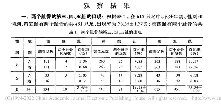 我根据一些文章提供的数据,仔细找了相关文献,还真被我找到了,这个说法应该来自1963年8月《解剖学报》的一篇文章——《中国人第三、四、五趾趾骨数目的观察》。