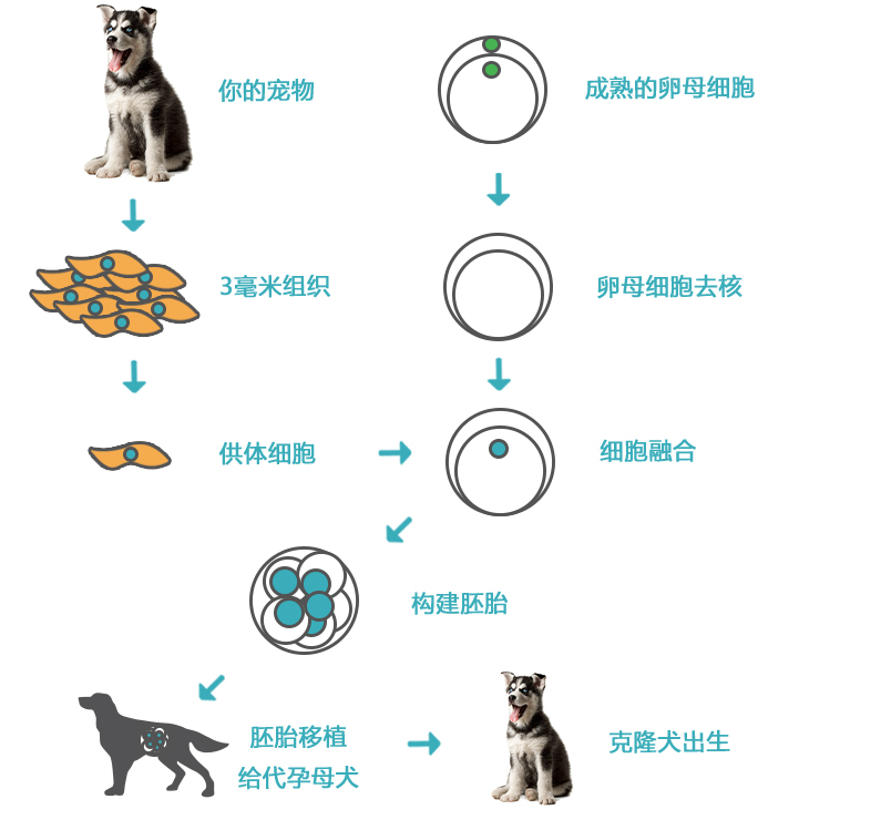 然后就是将胚胎整个植入其他雌性犬体内,等待胚胎发育成熟,克隆犬就诞生了。