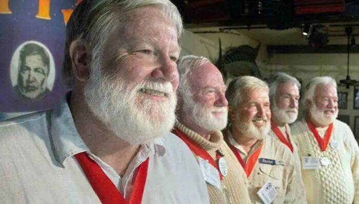 复制黏贴式的五官,笑起来一样的表情,标志性的姜黄色络腮胡,发型也差不多,就连外套,都是一样的黑色。
