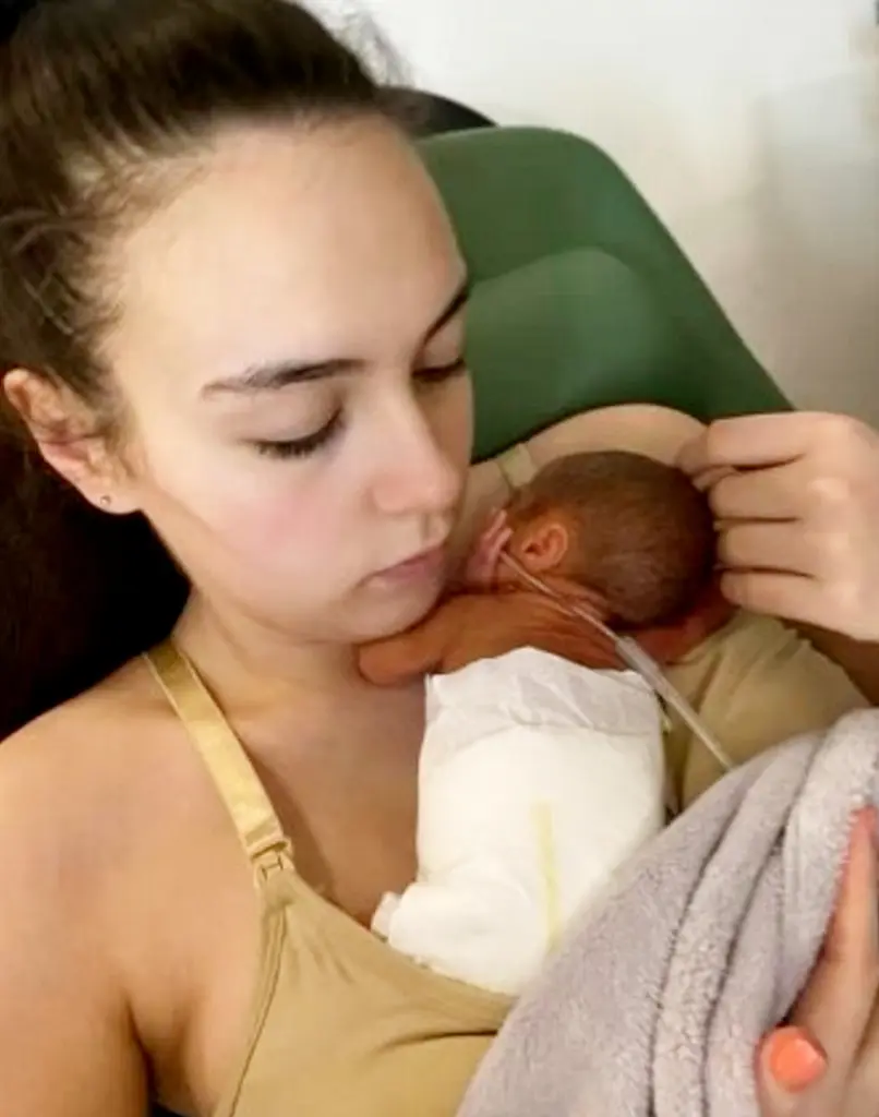 她在医院待了5天,在3月20日凌晨4点20分,自然产下一个小婴儿阿洛 (Arlo),阿洛是早产儿,只有22周多,体重只有500g。