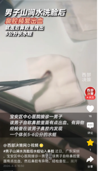 只是洗了一把脸,广东陈先生鼻子里竟然“长”了一条水蛭,至少有5cm长。