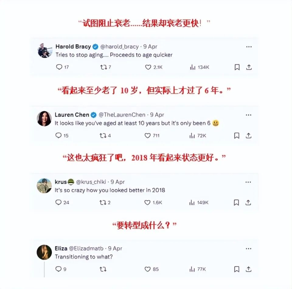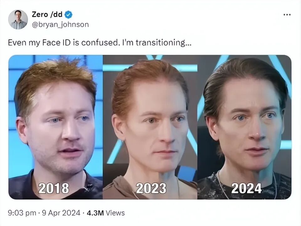 他认为效果很显著,对外声称:自2021年以来,自己身体年龄已经越来越年轻了,现在拥有37 岁的心脏、28 岁的皮肤和 18 岁的肺。