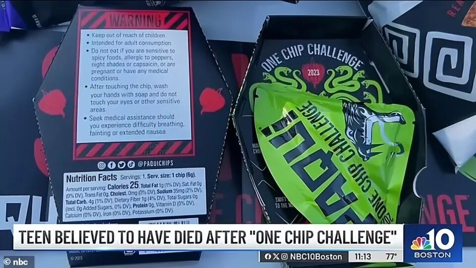 据报道,这个挑战前两年在年轻人中非常流行,由零售商Paqui玉米片发起的,挑战的内容就是吃下一片沾满超辣辣椒粉的玉米片,看看参与者能坚持多久不吃食物不喝水。能坚持一个小时的人,将获得“顶级掠食者”称号。