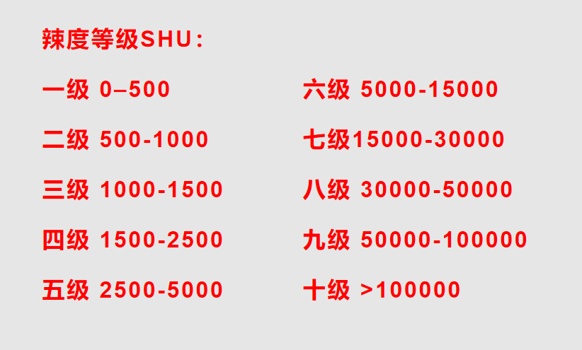 辣度来自辣椒素,科学家将辣椒和糖水稀释混合,早期是用人的舌头来尝,标准则是尝不到辣味为止,此时糖水稀释的数量就代表辣度。