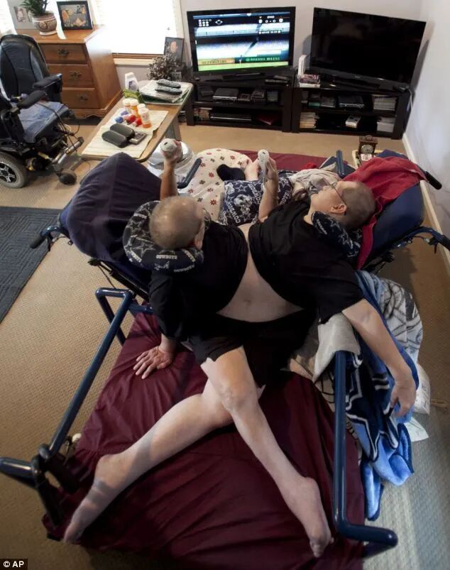 直到2010年,有个医院给他们捐赠了一张特制的床椅,可以支撑他们同时坐,同时睡觉,两人才同时拥有难得的美好睡眠。