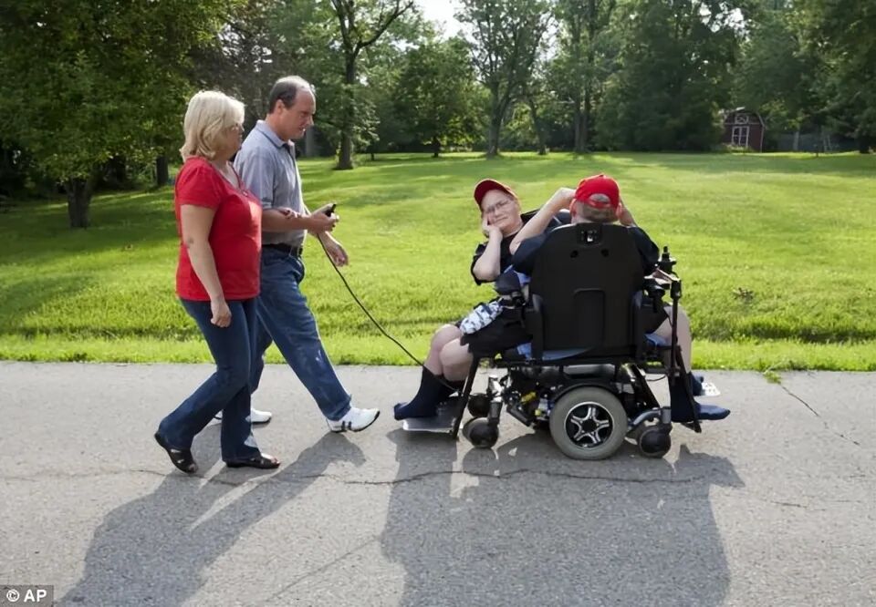 与此同时,社区还给他们定制了一把特殊的轮椅,这样弟弟吉姆就可以带双胞胎出去遛弯,去看棒球比赛,去参加集市,去餐馆吃饭。