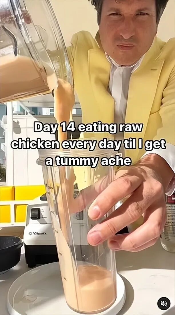 最让人难以接受的吃法是,他将鸡肉和橙子一起打成“奶昔”,然后再喝掉,着实让人感觉生理不适。