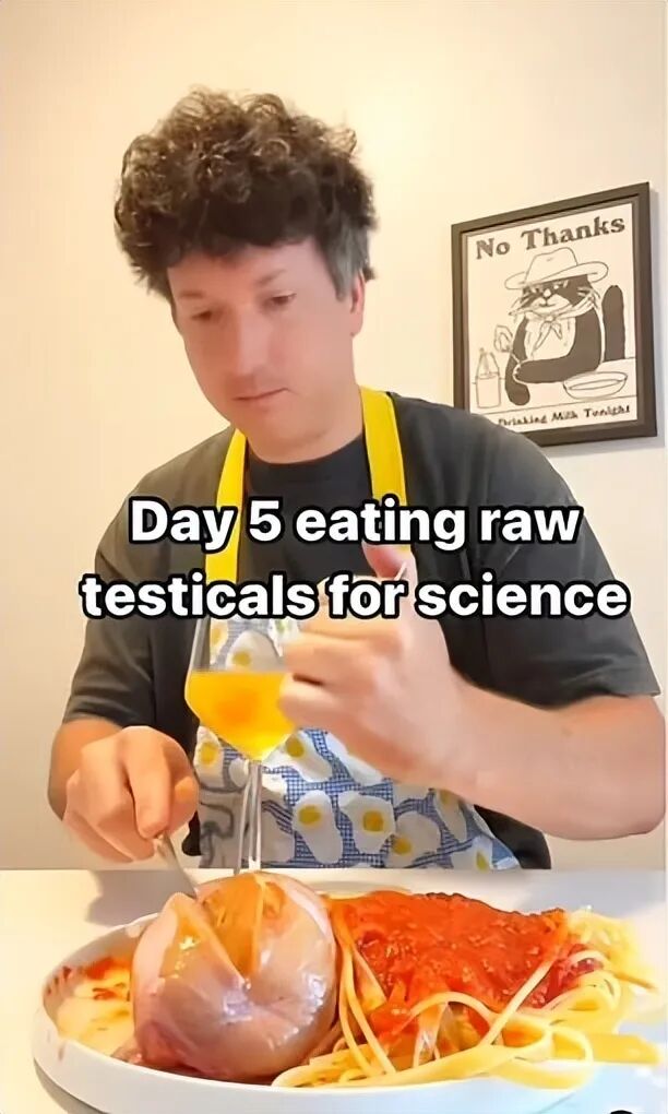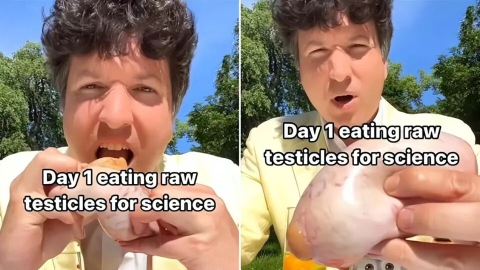 即使人人都知道这是不健康的,依然有人会去做。很大一部分原因是,网络博主已经饱和,生吃牛肉已经不能吸引流量了,只有尝试牛蛋或者牛丁丁,才能彰显自己的特别之处!