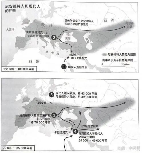 直到5 万至4万年前,现代智人再次迁徙到欧洲和亚洲。现代智人的重大转变被认为发生在7万年前前后——变得有别于其它人属物种,所以这次迁徙直接让尼安德特人消失在了历史舞台。
