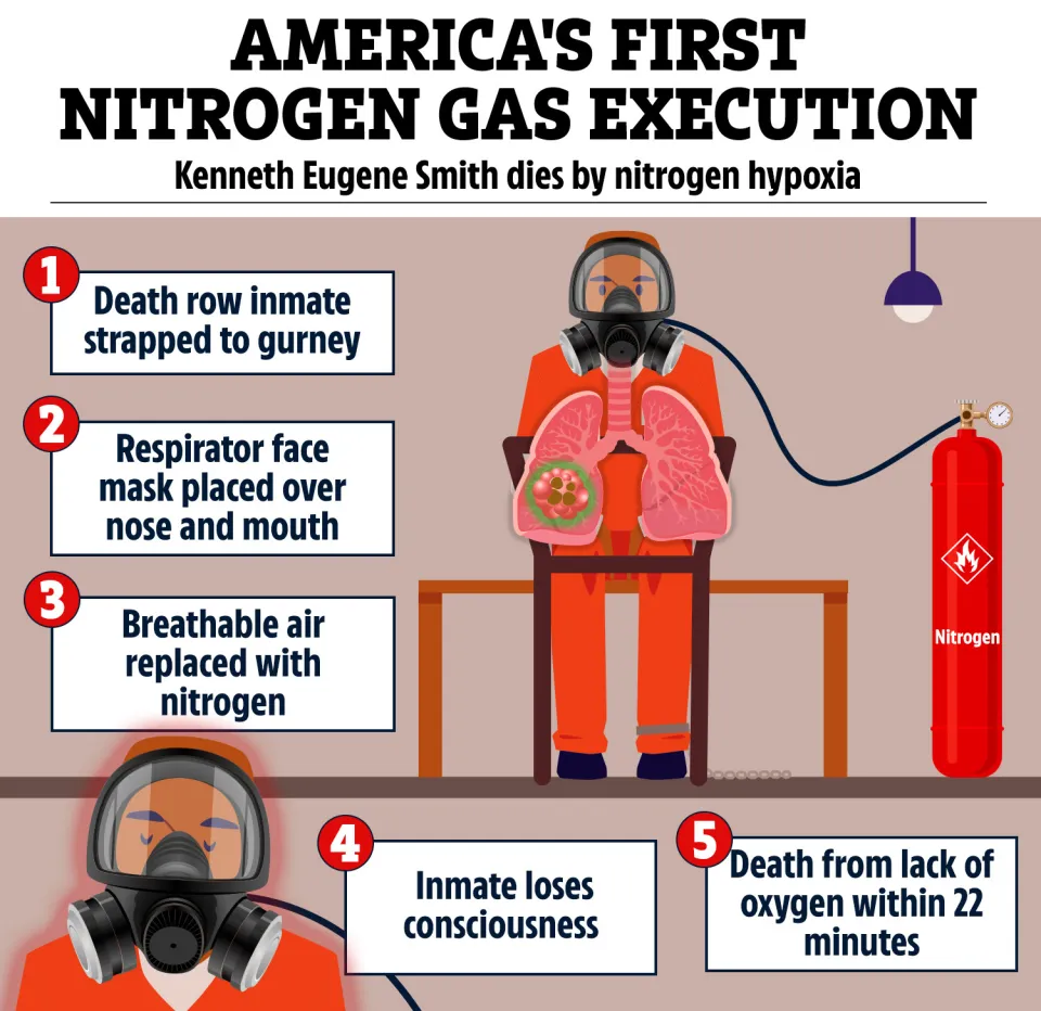 2024年1月25日,美国首次执行了氮气死刑,有旁观者透露,死刑犯在轮床上剧烈挣扎,看起来很痛苦。