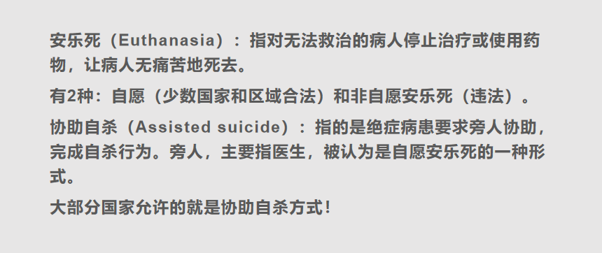 首先要明确一点,很多国家允许安乐死,大多是指允许“协助自杀”。