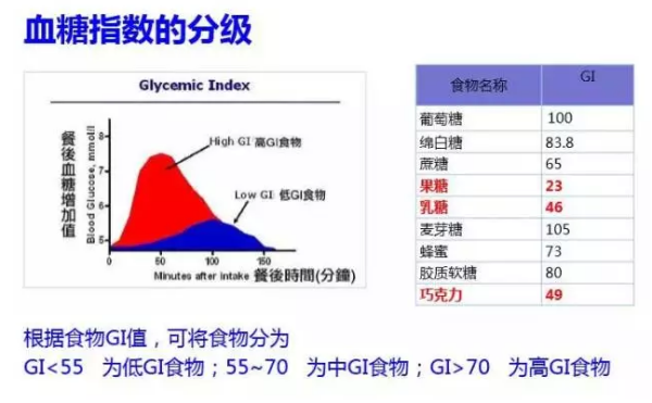 说到这里我们就要提到GI。食品的GI是血糖生成指数。通俗的说也就是你吃了一种食物后血糖升高程度的指标。