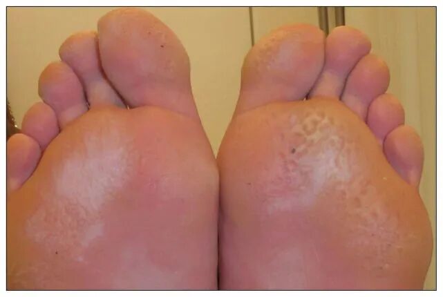 足藓又称为脚气、香港脚,是由皮肤藓菌引起的真菌感染,常发生在足底、脚趾间的皮肤,表现为水疱、浸渍、角化、脱屑、裂口,常伴有瘙痒,具有传染性。