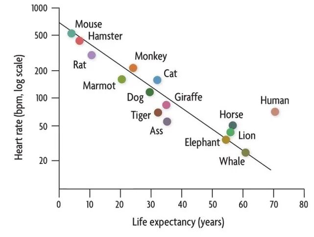 从上面这张图片中可以看出,除了人之外,大部分野生动物的心跳和寿命成反比,而人类确实跳出了这条比率线。
