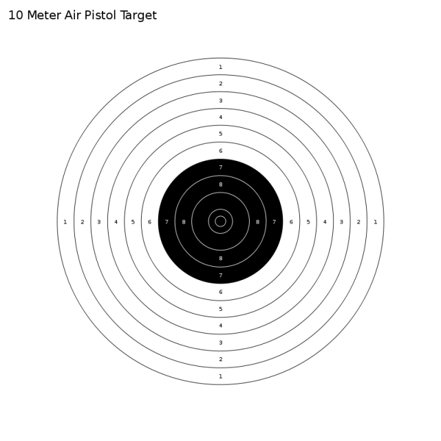 10米气步枪的靶子所有环直径是45.5毫米(一个一块钱的硬币差都有25毫米),而第10环直径只有0.5毫米,以我的视力在10米估计都看不清整个靶子,很难想象打到10环上是什么概念;