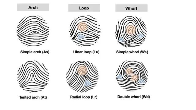指纹是手指末端凹凸不平的纹路,主要有三种形状:斗、箕和弓型。顺口溜里的螺型就是斗型。