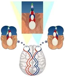 由于眼睛在脸上存在一些距离,所以每个视网膜产生的图像略有不同,大脑根据这种不同推算出“深度”。