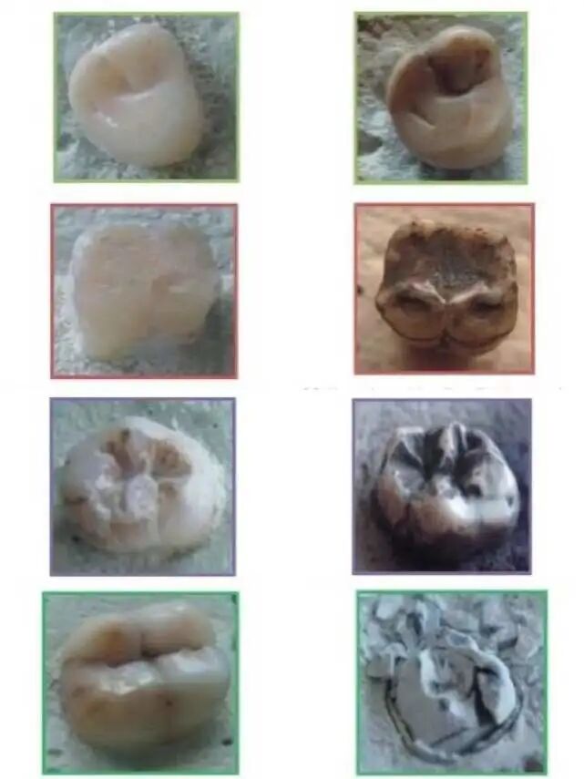 结果显示,前三组温度较低,牙齿外观没有明显损伤,只是颜色由浅变深,而最后一组温度比较高,直接变成黑炭色,形状发生严重变化,变成小碎片和灰烬。