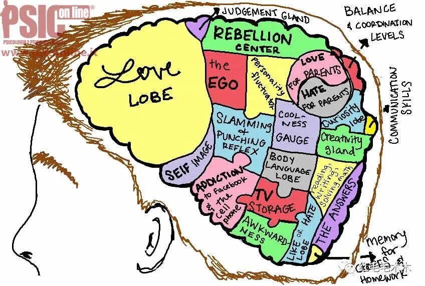 请看一下下面这个形象的青春期大脑,这个时候的孩子脑中,充斥着很多事情。而学习往往不那么重要了。(图2)