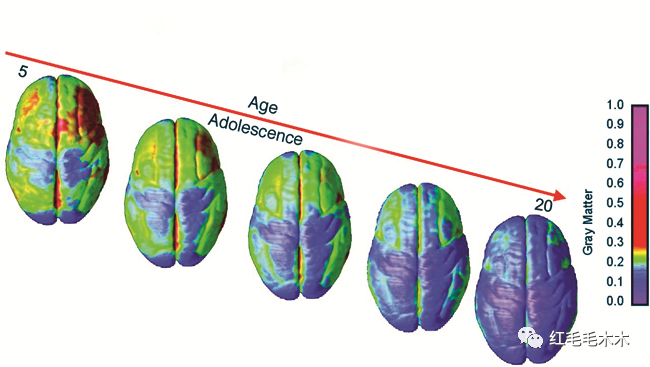 2004年发表在PNAS(美国科学院院报)的文章专门研究了人从5岁到20岁的大脑变化,研究发现,随着年龄增长,人的大脑皮层逐渐发育成熟,而真正全部成熟需要到20岁。(图1)