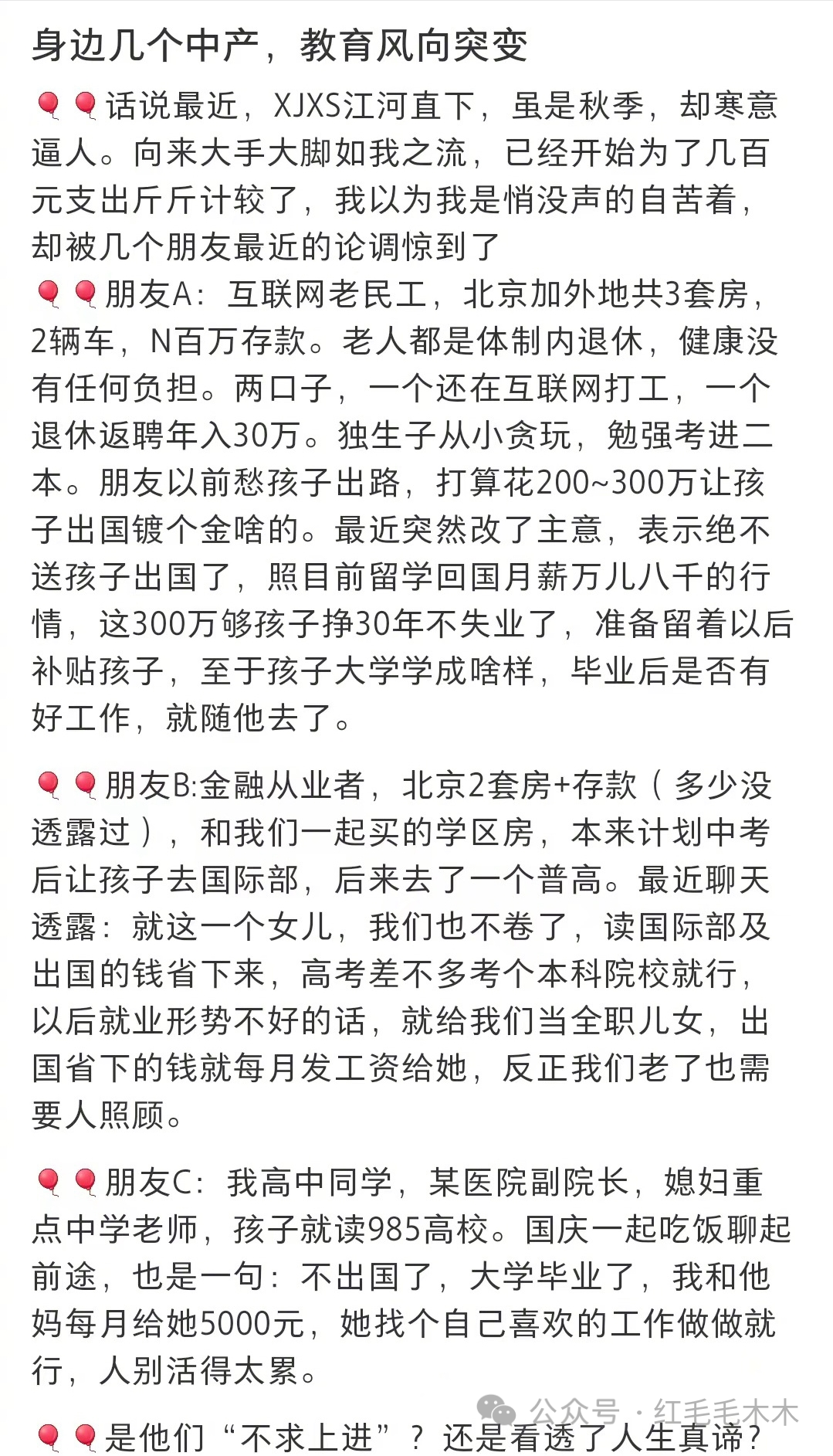 所以看似中产的躺平,其实更多是,中产开始理性回归,开始理性的看待自己的孩子,看待现在的教育方式,以及最后的可能出路。