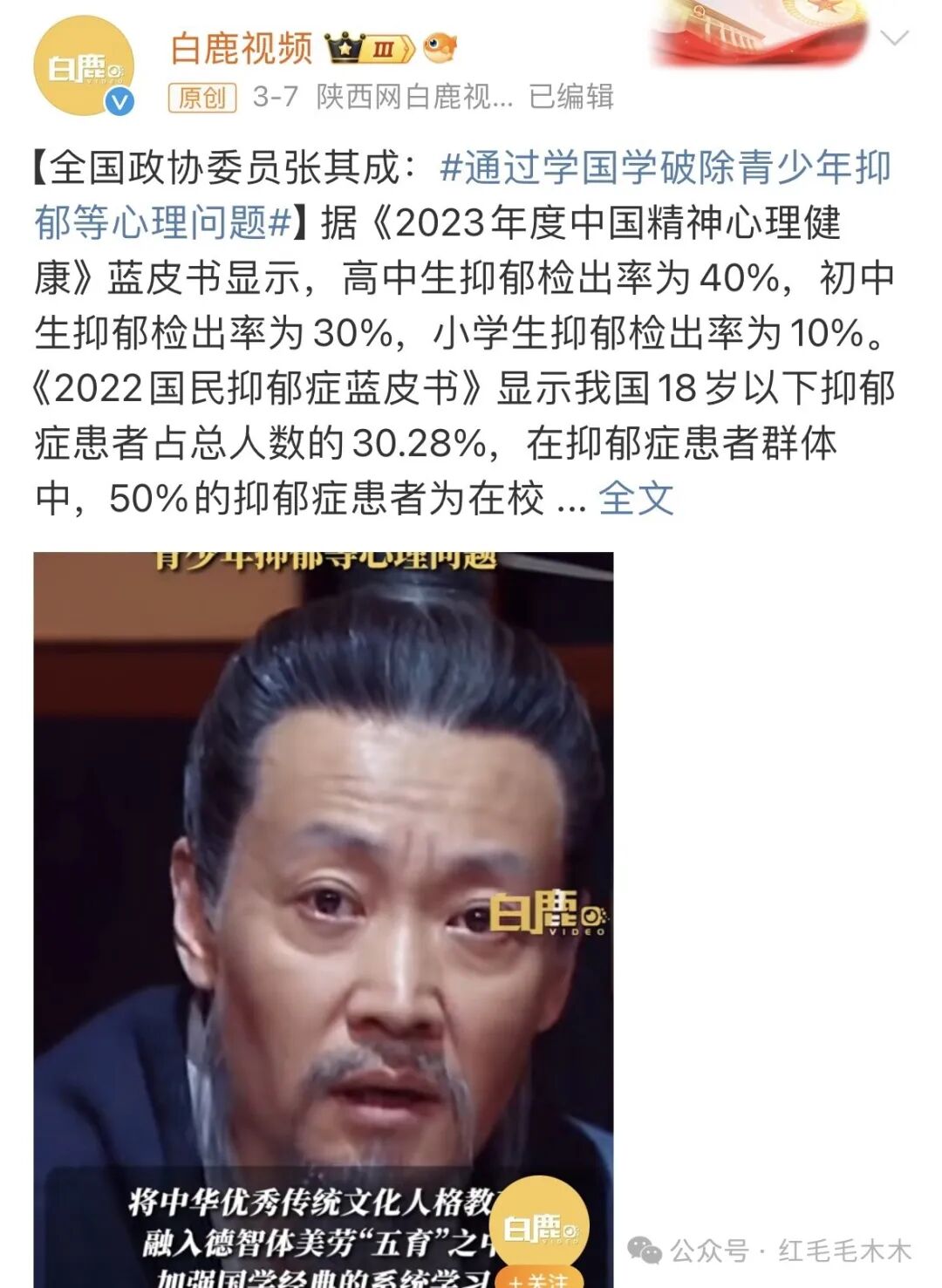 这两个委员认为,现在之所以青少年抑郁症那么多,是因为国学学的太少,而学了国学孩子抑郁率就降低了;再加点挫折教育,这样孩子遇到挫折就不会抑郁了!