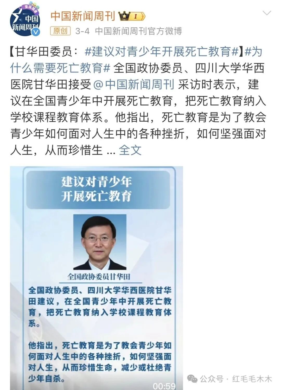 还有这位委员,建议对孩子开展死亡教育来减少抑郁症发生率和青少年自杀率。