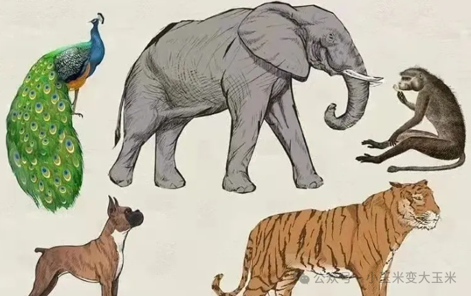 而小玉米放弃顺序:大象→孔雀→老虎→猴子→狗
