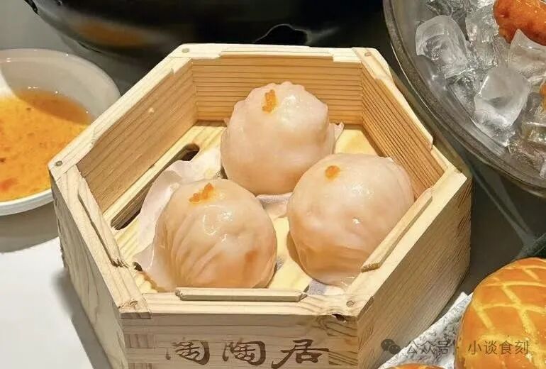 张帆在陶陶居总共是点了8个菜,其中第一个就是大虾饺,这个是陶陶居的招牌,据说每只虾饺要求有13道褶子,每只包含3只大虾仁,馅料由鲜笋丁、猪肉三肥七瘦调制而成,吃起来直接爆汁,相当的美味。