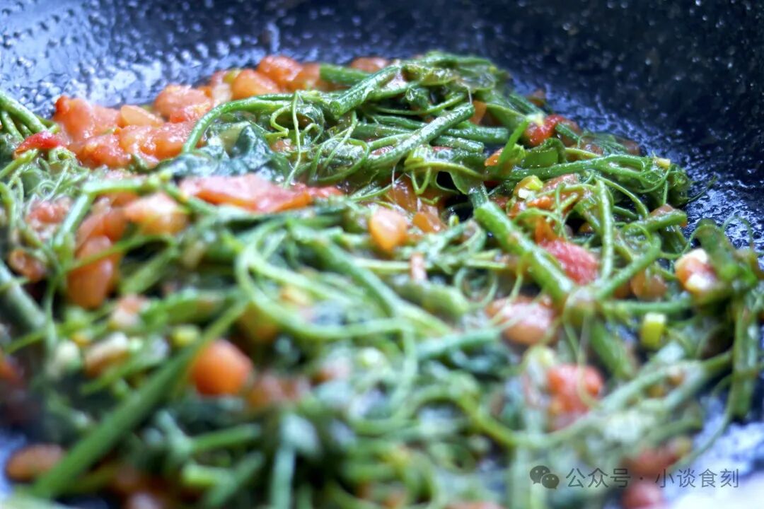 做法:1、把龙须菜清洗干净,我们只需选择比较鲜嫩的一部分就可以了;2、锅中放入植物油,烧热之后,放入蒜末,接着放入切好的西红柿进去翻炒,把它炒香,炒出红沙,接着倒入龙须菜;3、把它不断的进行翻炒,放入盐加入少许的鸡粉,炒至入味,就可以直接出锅了。