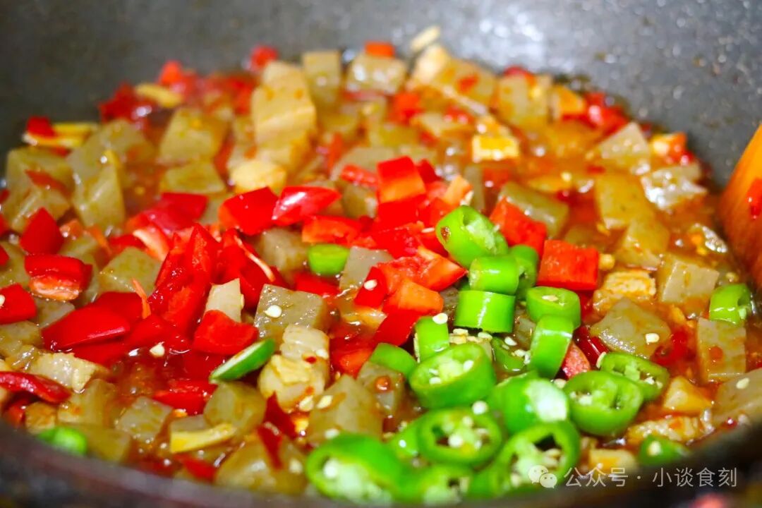 所需食材:青辣椒、红辣椒、魔芋1块、植物油、盐、豆瓣酱、酱油、鸡粉