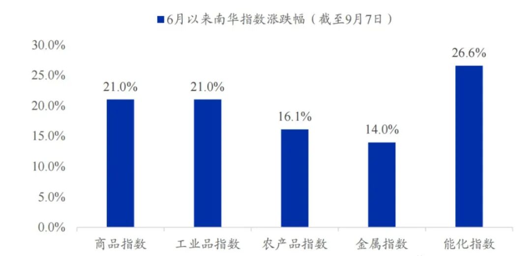 截至9月7日,6月以来南华农产品价格指数累计上涨16.1%,工业品价格指数累计上涨21%,与全部商品指数涨幅基本持平,其中,金属价格指数累计涨幅为14%,能化价格指数累计上涨26.6%。