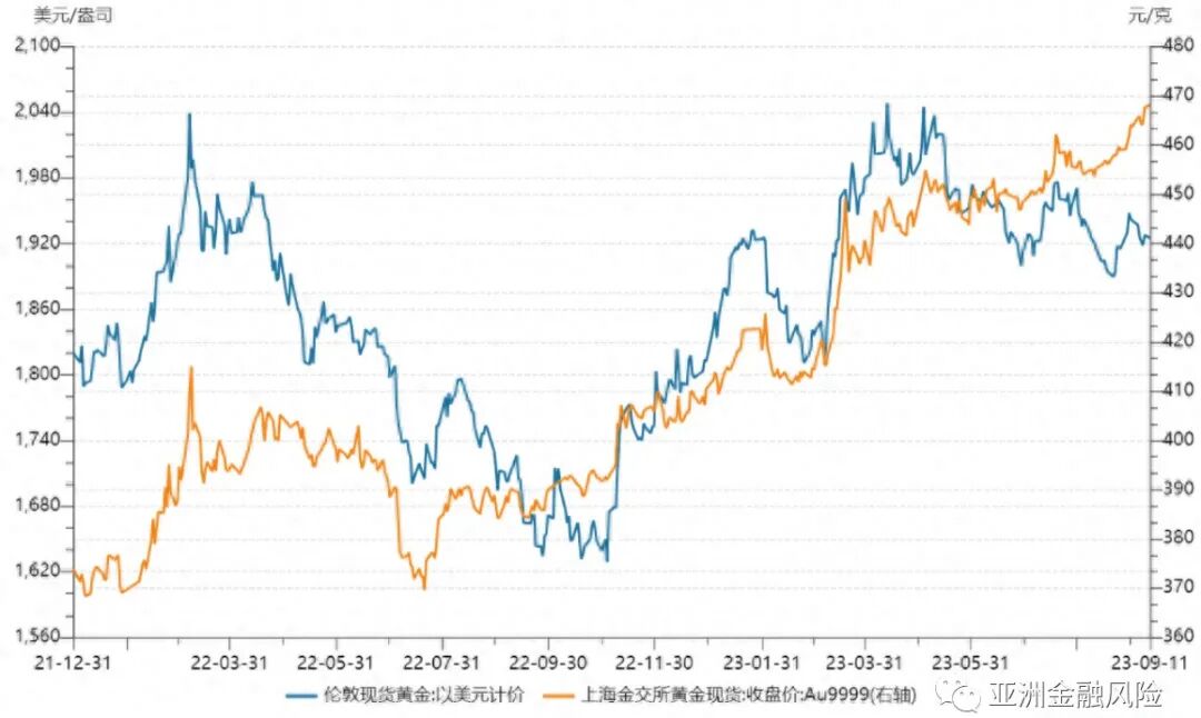 目前,伦敦现货黄金的价格为1923美元/盎司,按1盎司=31.1克计算,约为62.25美元/克。上海现货黄金价格为471.6元/克。