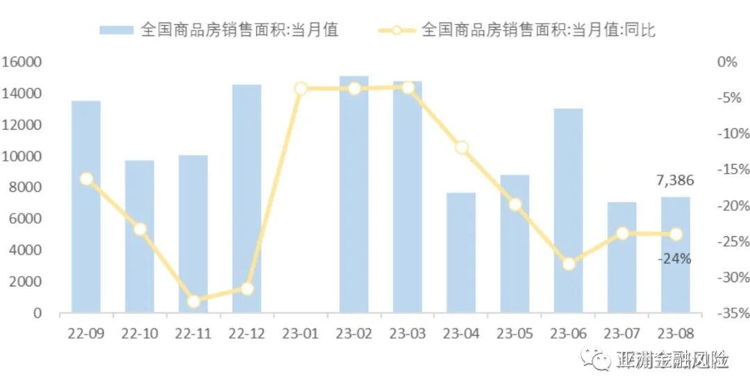 根据国家统计局的数据显示,8月份全国商品房成交建筑面积为7386万平米,同比下降22%,跌幅扩大0.1个百分点。