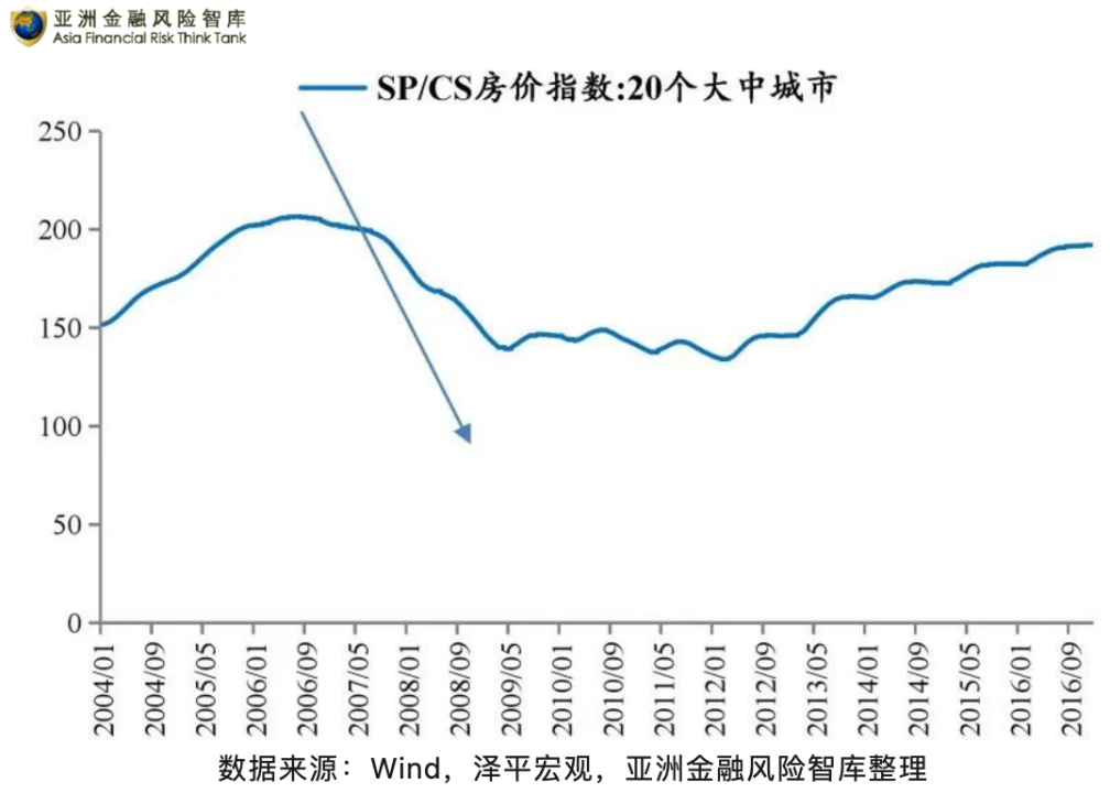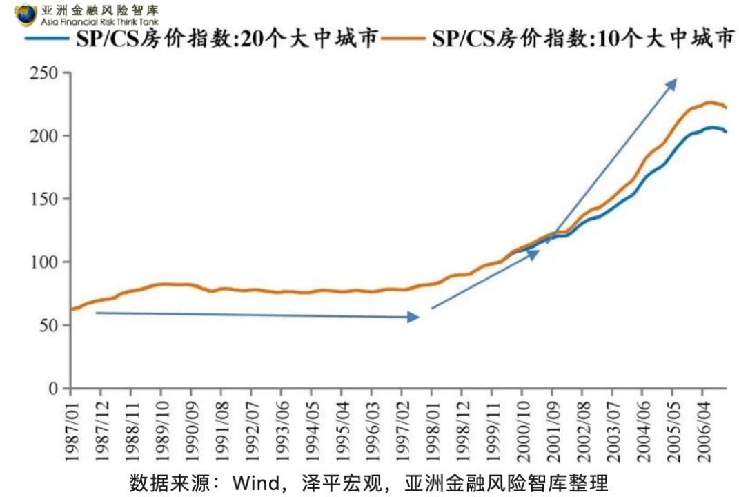 在流动性过剩和低利率刺激下,房价一路攀升。2000~2007年的房价涨幅大大超过了过去30多年来的长期增长趋势。