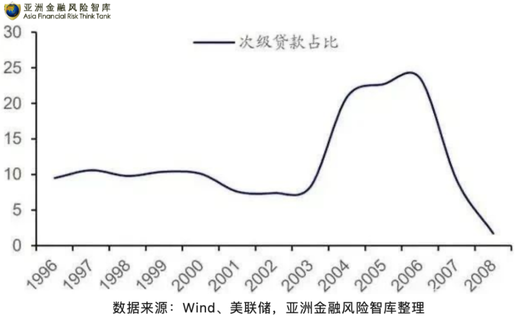 在 2003-2006 年间,美国抵押贷款中次级贷款的比重不断升高,在 2006 年接近 25%。