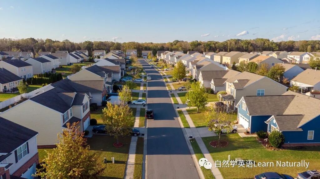 郊区人口密度比市中心低、高于乡间,房屋彼此之间距离较远,或者房屋成排而建,少有楼上楼下邻居同栋居住。
