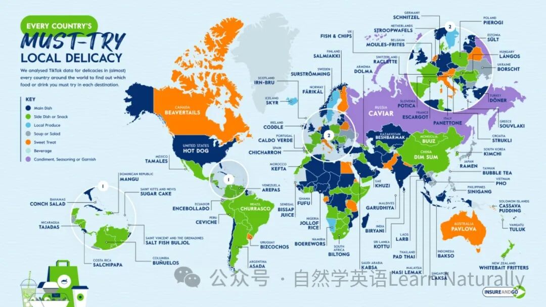 英国以炸鱼薯条称霸,法国必吃的榜首是烤田螺。全球各国入选的必吃美食以肉类为多,但也有部分符合素食主义者的需求,例如马来西亚椰浆饭、泰式炒河粉。甜咸之争则以咸食大胜,仅有38国的必吃美味以甜食居冠。